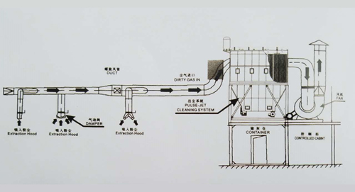本除塵器采用下抽上排內(nei) 循環的工作方式。其設計原則是在滿足生產(chan) 工藝要求的前提下,主要從(cong) 打磨工人的作業(ye) 環境,設備的運行可靠,操作維修便利等幾方麵考慮,改善工作區的作業(ye) 環境。